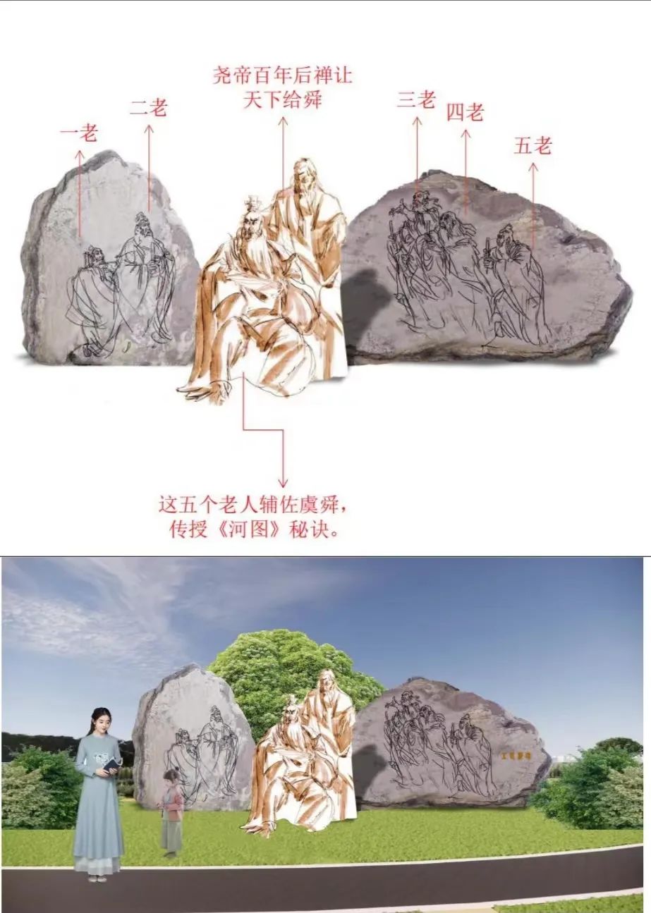 古代帝王授命于天,替天行道,故稱(chēng)天子。于是,歷代帝王及其王權(quán)都希望得到上天之認(rèn)可,這便是祥瑞出世,順天應(yīng)命。堯通過(guò)考察,覺(jué)得舜有擔(dān)當(dāng)、行德孝,欲讓天下給他,但不知天意如何。偶逢九月九日,便率領(lǐng)舜等大臣登上首陽(yáng)山,觀察大河及河西之洛河、涇河。這時(shí),有五個(gè)老人也在游河渚,乃是二十八宿的精靈昴日雞。其中一老告訴堯舜說(shuō):“河圖將來(lái)告帝期。”二老曰:“河圖將來(lái)告帝謀。”三老曰:“河圖將來(lái)告帝書(shū)。”四老曰:“河圖將來(lái)告帝圖。”五老曰:“河圖將來(lái)告帝符。”然后化為流星,飛升上入昴宿。不久,有兩條紅胡子龍負(fù)圖而出,堯與舜共同觀看,上邊寫(xiě)道:“帝當(dāng)樞百則禪虞。”說(shuō)堯帝百年后禪讓給舜。帝堯便感嘆道:“天之歷數(shù)在爾躬!”原來(lái),上天的歷數(shù)落在你的身上!于是,便把天下禪讓給了舜。這五個(gè)老人為了教導(dǎo)輔佐虞舜,傳授《河圖》秘訣,便落戶(hù)在了永濟(jì)的虞鄉(xiāng),就是五老峰?!渡胶=?jīng)》即根據(jù)五老《河圖》演繹而成,沒(méi)有五老峰,便沒(méi)有《河圖》。