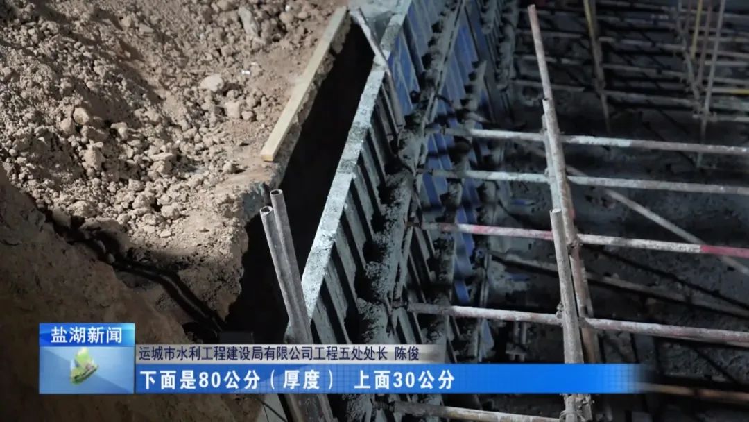 目前進行的是仰斜式擋墻的澆筑,澆筑一共分五步,因為它垂直高度2.5米,不能一次澆筑完,澆筑一次,休息一會,達到初凝,再澆第二次,咱們目前在的地方已經(jīng)澆筑四次了,再差一層就澆筑完了,這個完成了以后,咱們農(nóng)村段24公里就全線貫通。